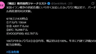 2026年4月19日(日)。 米国イラン戦争の供給危機にいち早く反応したDr.パパと戦記君で、バーチャル資産運用対決実験。 4/18(土)14:30時点 ①ドル円: 158.64 ②金: 4,831ドル/oz ③ ...