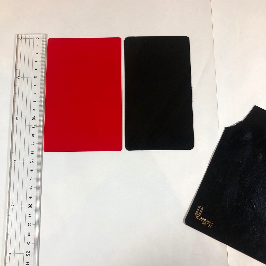 破損していた黒い下敷きを採寸し、カッターで切れ目をつけて曲げることにより切断。その上でやすり掛けをして、角を滑らかにしました。ケバ取りは丁寧に。手触りは大事だからね。