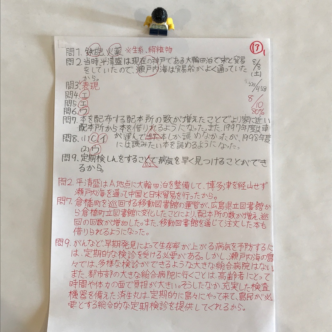 結果は、8問/全10問=80%。記述問題は8問中1問を間違えただけです。