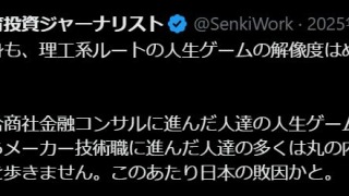 2025年11月27日(木)。【2026年1月30日(金)記録】 「戦記氏自身も、理工系ルートの人生ゲームの解像度はめっちゃ低いしね。」 理系から総合商社金融コンサルに進んだ人達の人生ゲームは観察していますが、理 ...
