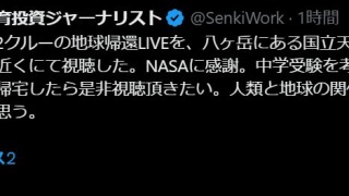 高2/Twitterの記録:「アルテミス2クルーの地球帰還LIVEを、八ヶ岳にある国立天文台野辺山宇宙電波観測所の近くにて視聴した」