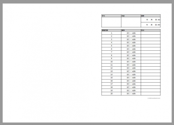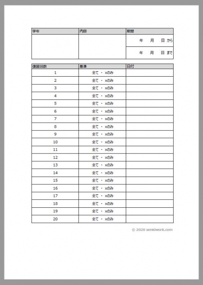 A4コピーで集めた漢字の間違い(=宝物)を閉じる表紙です。20回分まで復習できるようになっています。解いた日付を記録することで、「では次回は1週間後にやろう!」といったアクションが取りやすくなります。