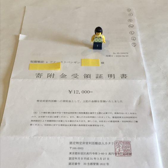 カタリバさんへの2020年9月分の寄付の領収書を受領しました。累計寄付金額は84,000円になりました。経済的理由で学びの機会を奪われているお子さんのお役に立てば嬉しく思います。