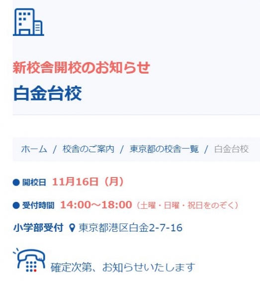 小5/サピックス:新校舎開校のお知らせ「白金台校」