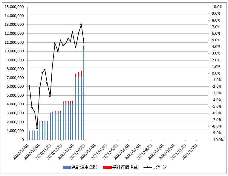 S&P500の投資歴0.4年。2020年9月~12月は100万円/monthを積立て、2021年1月からは300万円/monthを積み立てています。