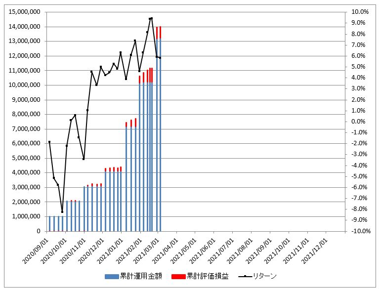 2020年9月~12月は100万円/monthを積立て、2021年1月からは300万円/monthを積み立てています。コツコツと、地味な積立です。