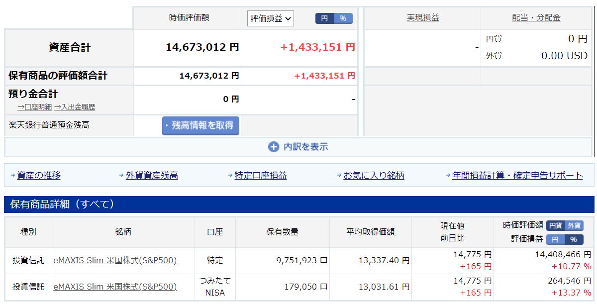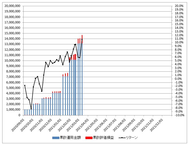 2020年9月~12月は100万円/monthを積立て、2021年1月からは300万円/monthを積み立てています。コツコツと、地味な積立です。