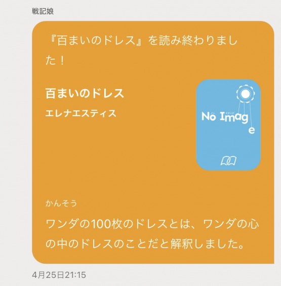 ・・・ヨンデミーアプリの「ほんの友」にも娘の感想が投稿される仕組みになっているようです。ヨンデミーのユーザー同士で、読書感想の交換ができるのは面白いですね。子供が「親に読んで貰いたいと思う見開きページ」のデータも収集した方が、今後のプロダクト開発にも有用だと思いますけどね。ヨンデミー利用者のブログや口コミで、このような使い方が広がっていくと、僕としても助かります。娘が大事ではないと思ったページが、他のお子さんが大事だと考えるならば、その差異から娘が学ぶことができるからです。