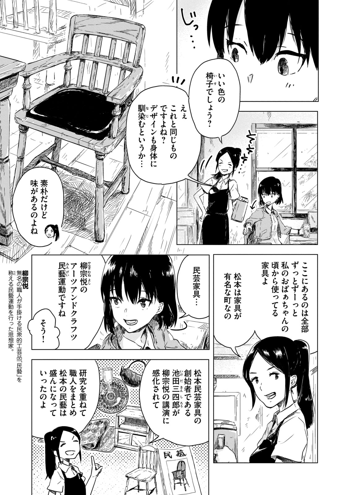 松本の「民芸家具」、「柳宗悦(やなぎむねよし)」のアーツアンドクラフツ、民藝運動(みんげいうんどう)について解説されています。
