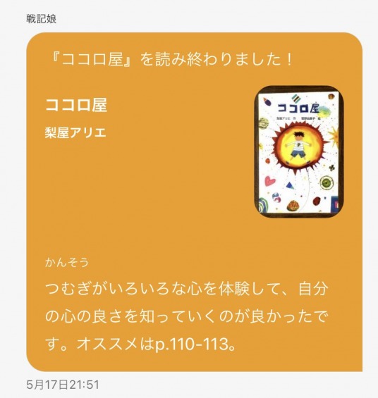 ちょうど昨日5月17日(月)にヨンデミーに感想文を提出していました。ヨンデミーのユーザーの方には「ほんの友」で娘の感想がシェアされているので、確認してみてください。違う本の感想ですがw。