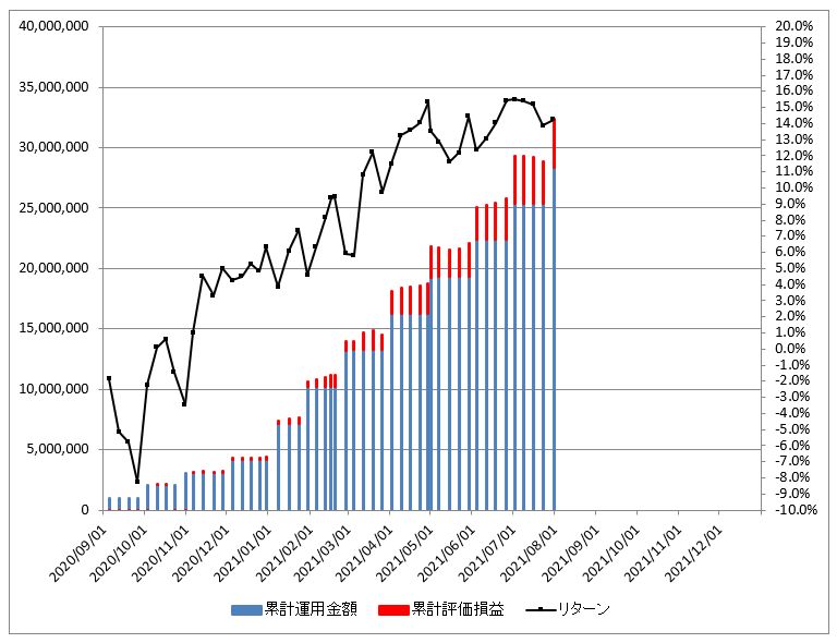 2020年9月~12月は100万円/monthを積立て、2021年1月からは300万円/monthを積み立てています。コツコツと、地味な積立です。