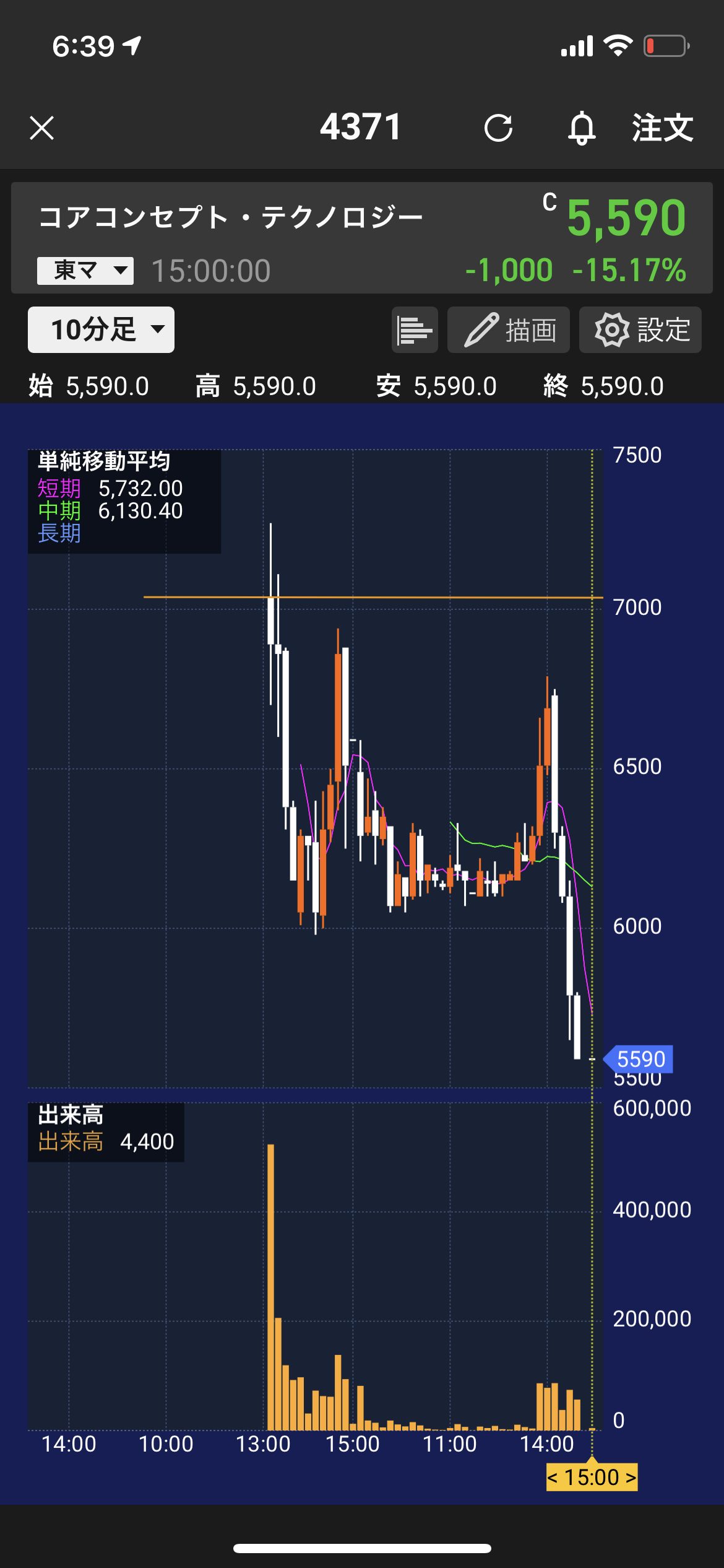 9月15日(水)に公募価格3,500円で100株取得し、22日(水)に初値7,040円で売却して利益確定しています。先ほど見てみたら、24日(金)はストップ安で5,590円まで下落していました。