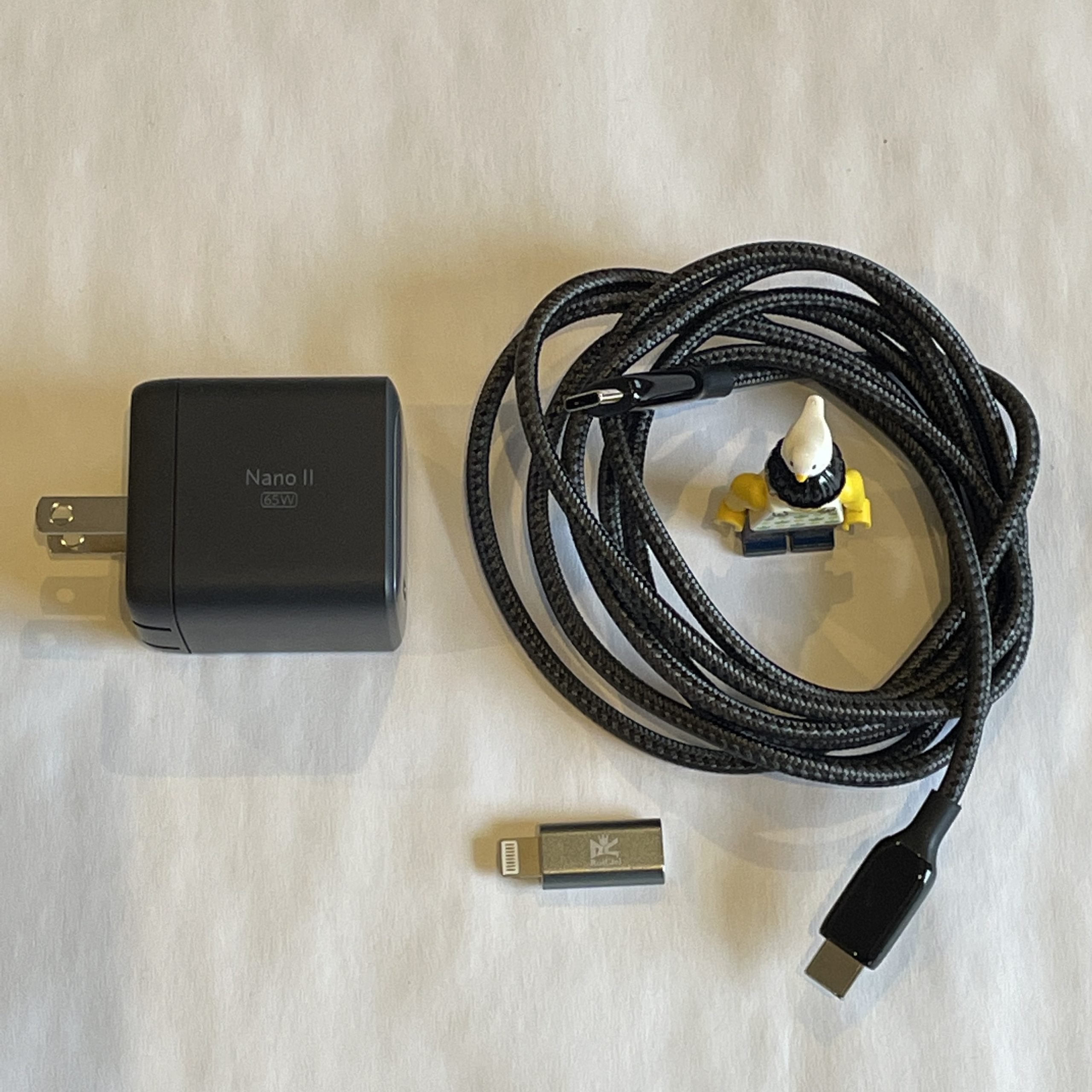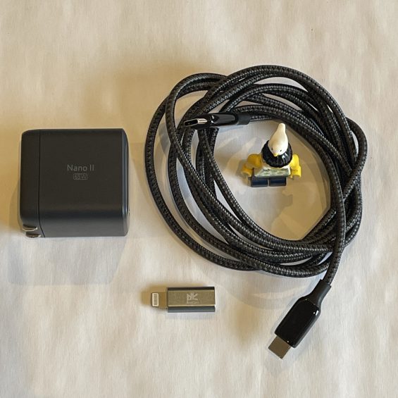 これにUSB-C→ライトニングアダプタがあれば、iPhoneへの給電も可能です。しまなみ海道サイクリングにては、ノートパソコンを運びましたが、電源系はこれ一つで対応できました。1.8mあると、新幹線の中での電源にも困りません。