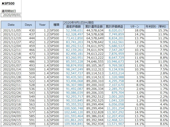 大学受験と資産運用:S&P500投資の運用結果(累計評価損益:+13,571,907円(過去最高) / 2022年4月23日(土))