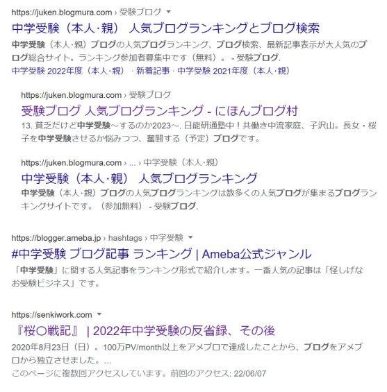 ・2022年6月8日:中1/中学受験:「中学受験 ブログ」でGoogle 3位に