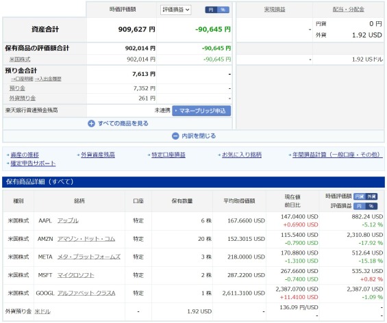 マイクロソフトがプラスに転じていますね。現状、ポートフォリオとしては▲9.0%ですが、これだけテック株のvalulationが剝げ落ちてもこの程度で済んでいるので、なんだかんだいってGAFAMのセットは強いように思います。