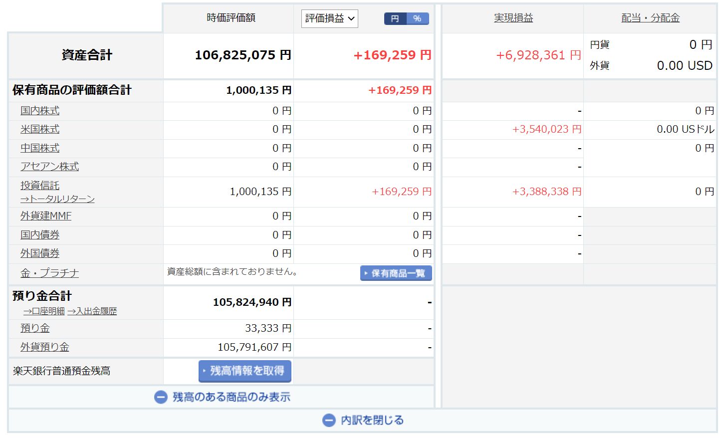 楽天証券の画面では、「実現損益:+6,928,361円」とあるが、これは「税前」なので、「税後」では+5,520,864円。しかし、「外貨預り金」の米ドルについては評価損益には反映されていない。
