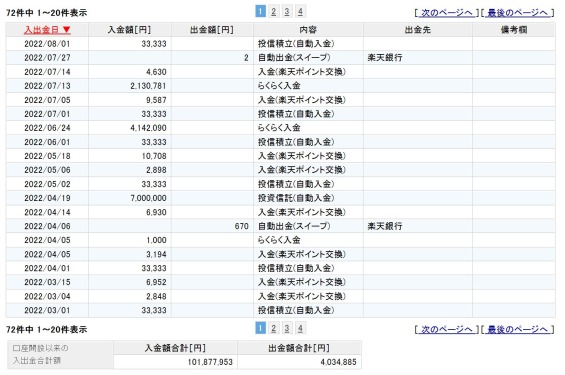 が分かりません。よって、入金額と出金額のデータを追いました。入金額が101,877,953円、出金額が4,034,885円なので、101,877,953 – 4,034,885 = 97,843,068円が運用額であり、僕が楽天証券の口座に送り込んだ日本円。尚、利益確定の課税はこの出金額にはカウントされない(表示されていないので)。よって、この方法で運用額を把握できる。