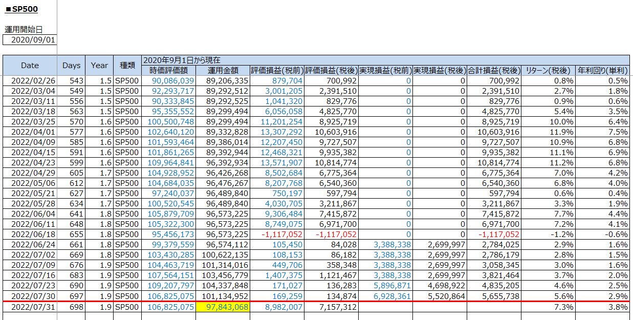鉄緑会への資産運用:S&P500投資の運用結果(評価損益/税後:+7,157,312円 / 2022年7月30日(土))