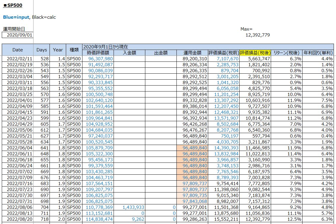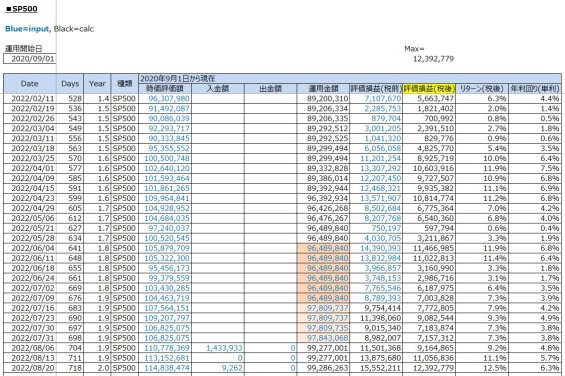 鉄緑会への資産運用:S&P500投資の運用結果(評価損益/税後:+12,392,779円 / 2022年8月20日(土))