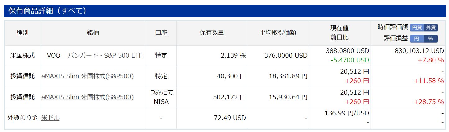 ⑧予想VOO配当:2,139株 x USD 1.30/Q x 4Q x (1-20.315%) = 税後USD 8,863/year, x @130 = 税後1,152,216円/year
