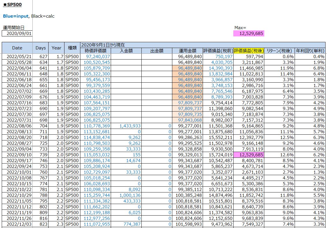 鉄緑会への資産運用:S&P500投資の運用結果(評価損益/税後:+7,549,327円 / 2022年12月3日(土))