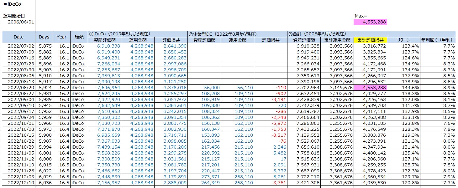 老後への資産運用:iDeCo投資の運用結果(累計評価損益:+4,059,630円 / 2022年12月10日(土))