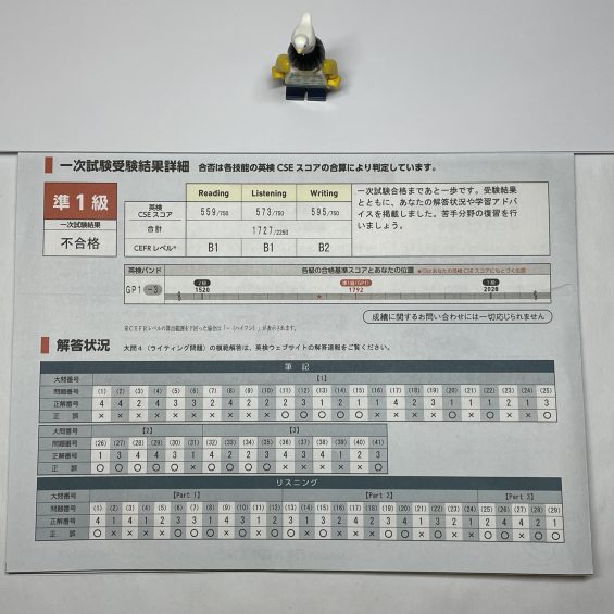 新中2/英検準1級:一次試験不合格の個人成績表(2023年2月11日(土))