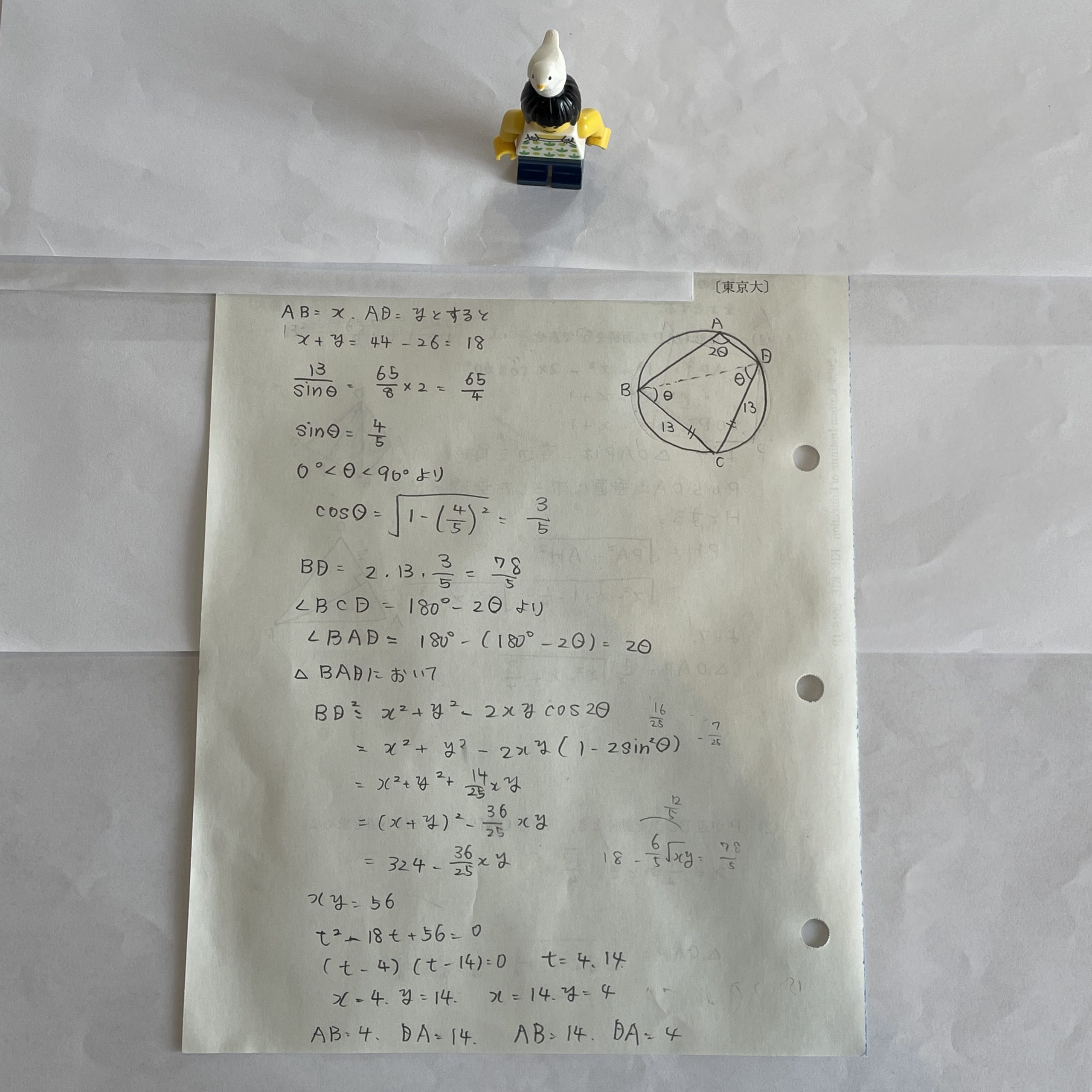 (2)四角形ABCDが、半径65/8の円に内接している。この四角形の周の長さが44で、辺BCと辺CDの長さがいずれも13であるとき、残りの2辺ABとDAの長さを求めよ。(東京大)