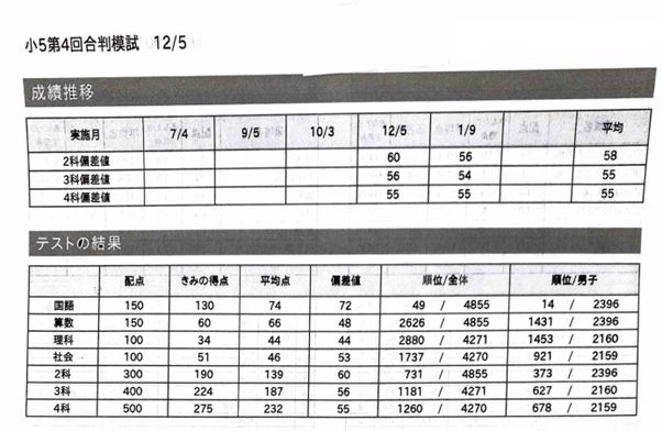 劇的な偏差値の変化はあまり無かったのですが、算数の偏差値は徐々に上昇しました。穴だらけだった算数が、計算など基本的な問題を安定して解けるようになるだけで、優位になっていくのですよね。小6以降の劇的な偏差値上昇は難しいわけですが。」