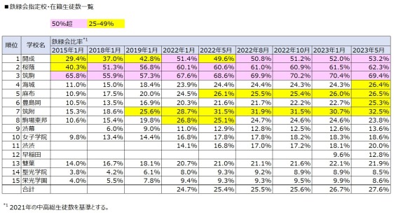 僕が2015年1月のデータから追っている鉄緑会。2023年5月の「鉄緑会指定校・在籍生徒数一覧」が更新されましたので、分析してみました。