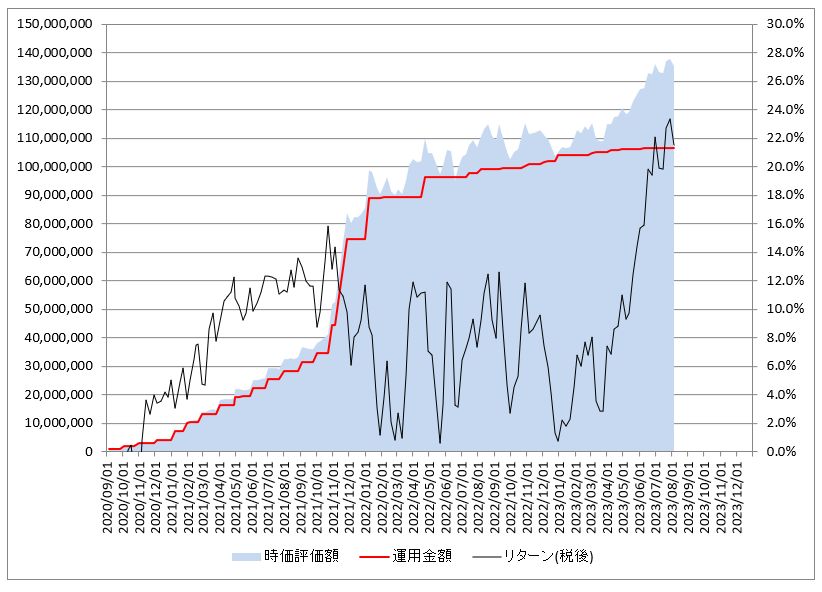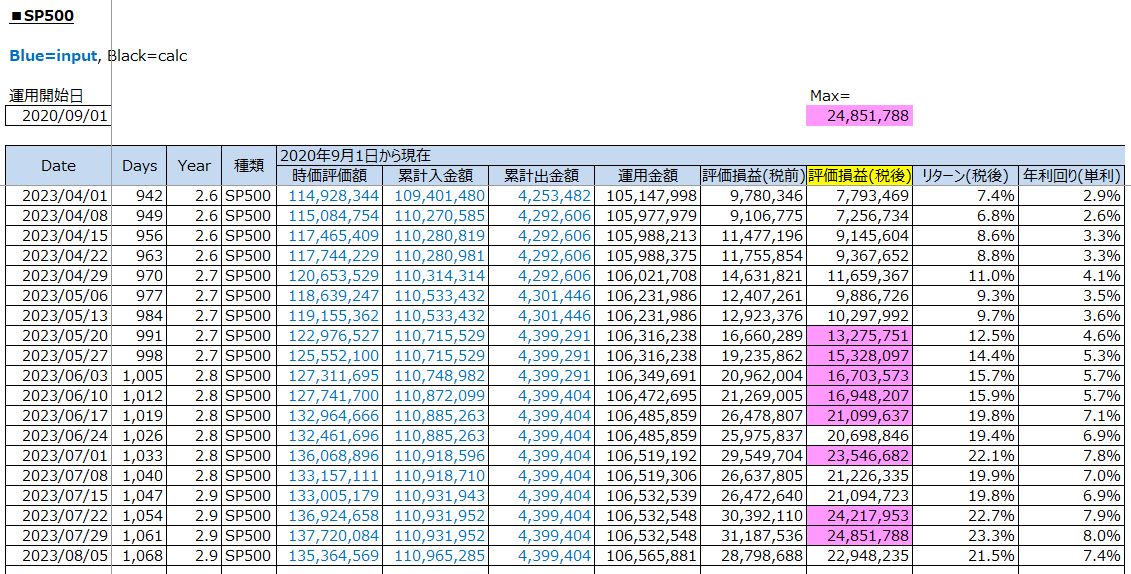 鉄緑会への資産運用:S&P500投資の運用結果(評価損益/税後:+22,948,235円 / 2023年8月5日(土))