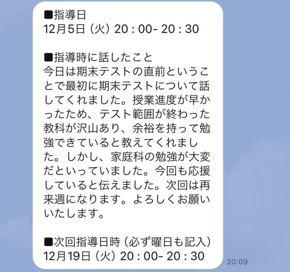 2学期期末テスト対策について、議論したようです。東大生コーチに説明することで、期末テストの方法論が洗練されていくことになります。