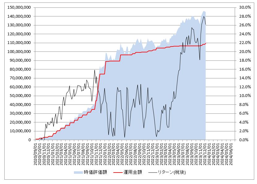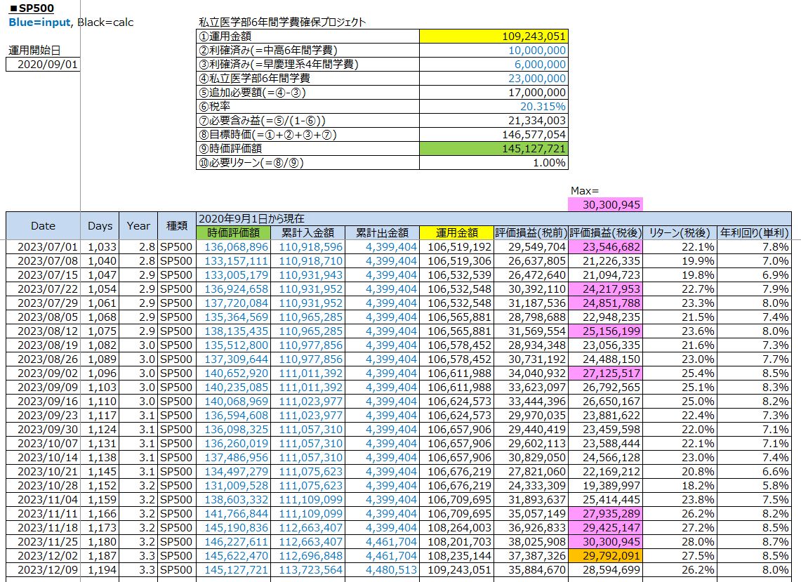 鉄緑会への資産運用:S&P500投資の運用結果(評価損益/税後:+28,594,699円 / 2023年12月9日(土))
