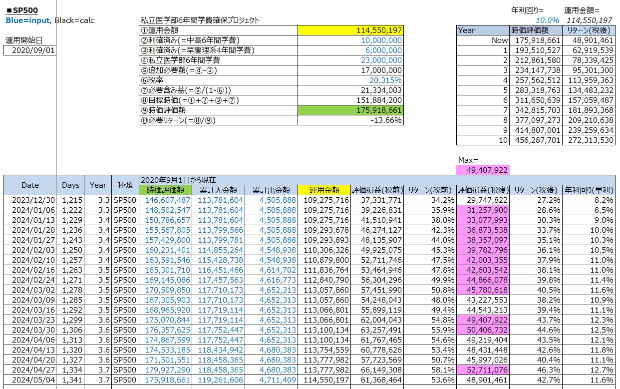 鉄緑会への資産運用:S&P500投資の運用結果(評価損益/税後:+48,901,461円 / 2024年5月4日(土))