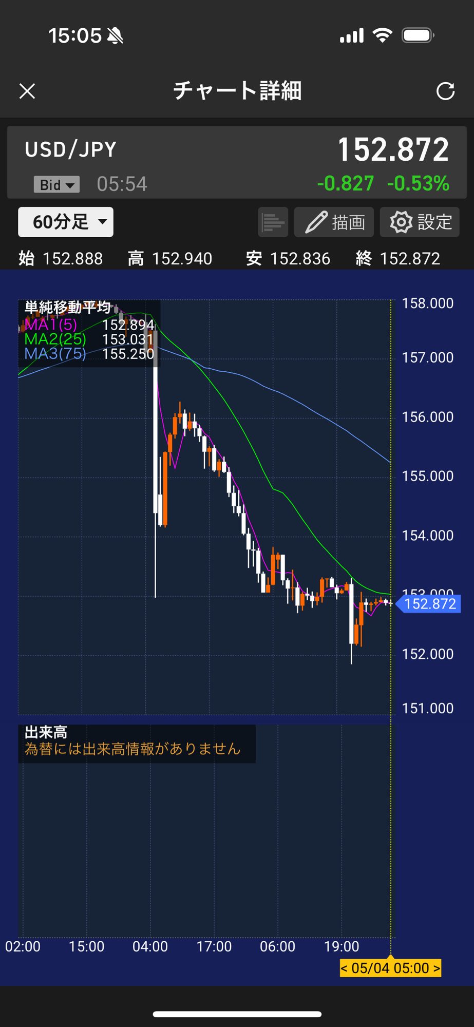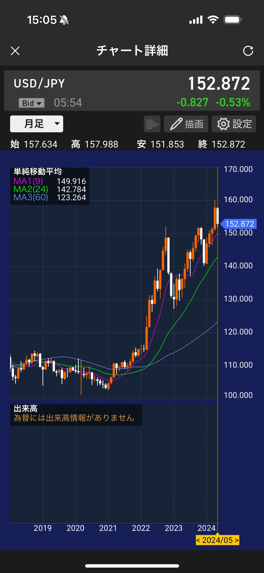 ・・・マーケットは一歩先は闇ですね。先週は、「今週後半は良い雰囲気。円安が154.43→158.29円と進んでいますが、為替介入も不可能でしょうね。結果として、公開実験用ポートフォリオも過去最高益を更新しました」と書きましたが、今週は為替介入の嵐でした。160円から151円まで変動。