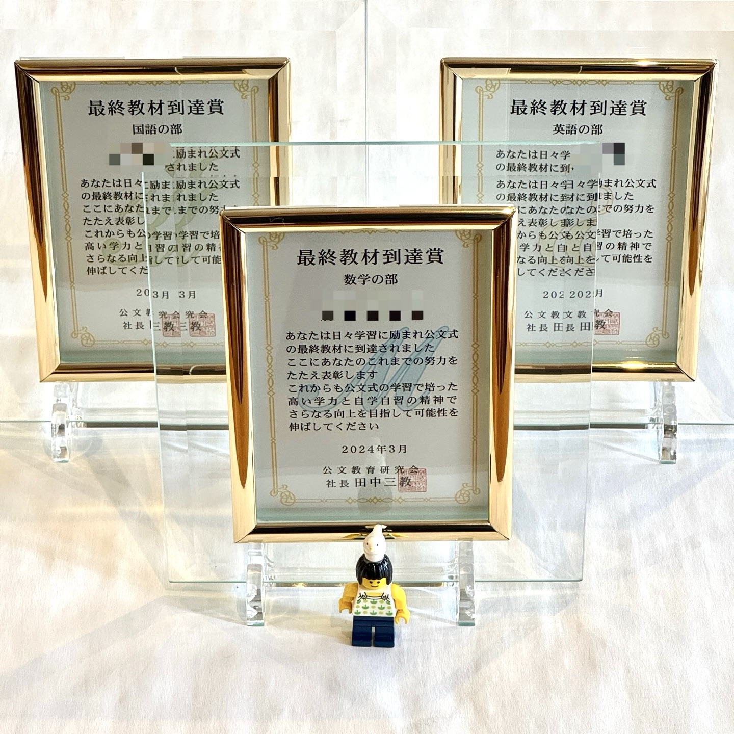 中3娘は年長の2015年10月に公文を開始したが、中3の5月に公文から数国英の最終教材到達賞を同時に受賞した。3科目同時受賞は珍しく、また娘は低学年時代に単元終了テストに合格するとケーキを食べていた逸話が本部にも伝わっており、一部関係者には「ケーキの子」として知られているらしい。