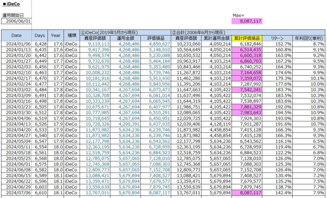 老後への資産運用:【過去最高益】iDeCo投資の運用結果(累計評価損益:+8,087,117円 / 2024年7月6日(土))