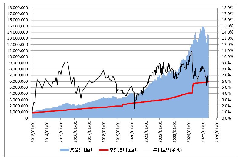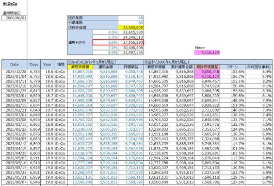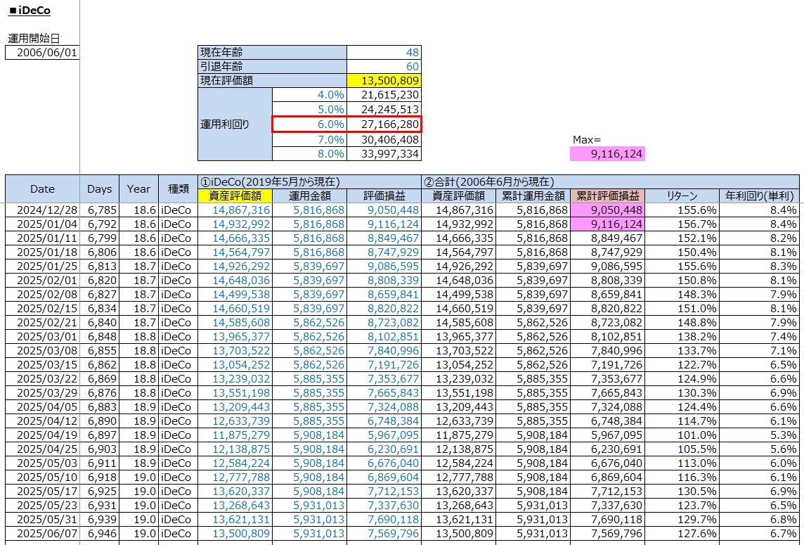 老後への資産運用:iDeCo投資の運用結果(累計評価損益:+7,569,796円 / 2025年6月7日(土))