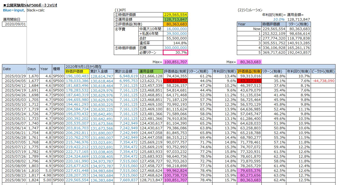 結論として、2020年8月13日に公開実験を開始し、1,187日目(=3.3年)の2023年12月2日(土)時点で、税後+3,300万円にて娘の全学費(=中高6年間1,000万円+私立医学部6年間2,300万円)を確保することに成功。また、1,817日目(=4.98年)の2025年8月23日(土)時点で税前+1億円を達成しました。