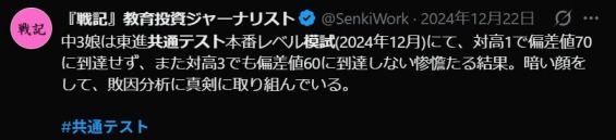 中3娘は東進共通テスト本番レベル模試(2024年12月)にて、対高1で偏差値70に到達せず、また対高3でも偏差値60に到達しない惨憺たる結果。暗い顔をして、敗因分析に真剣に取り組んでいる。#共通テスト pic.twitter.com/NGeSCUhR0D