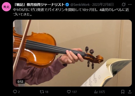 中2/Twitterの記録:「中1の5月にゼロ発進でバイオリンを開始して10ヶ月目。4歳児のレベルに近づいてきた。」