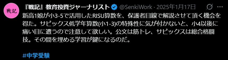 新高1/Twitterの記録:「新高1娘が小3-5で活用したRISU算数を、保護者目線で解説させて頂く機会を得た」