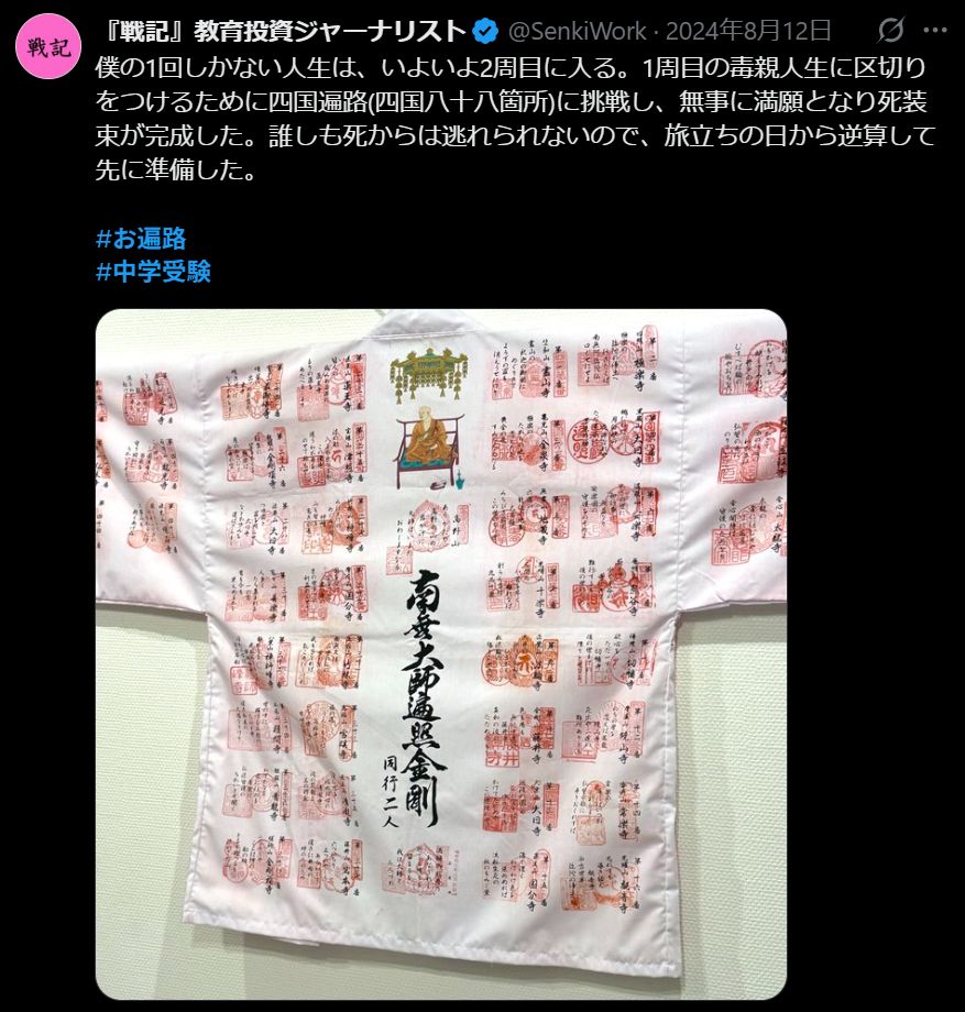 中3/Twitterの記録:「四国遍路(四国八十八箇所)に挑戦し、無事に満願となり死装束が完成した。」