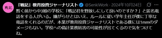 暫く前から中3娘の学校に「戦記君を野放しにして良いのですか?」と匿名電話をする人がいる。嫌がらせとはいえ、ルールに従い学年主任が僕に丁寧な電話をくれるのだが、本業が教育投資ジャーナリストである僕には1mmのダメージもない。学校への偽計業務妨害の可能性が出てくるので気をつけてね。