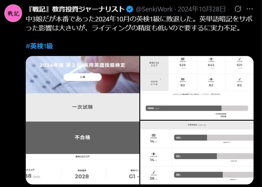 中3/Twitterの記録:「中3娘だが本番であった2024年10月の英検1級に敗退した。」