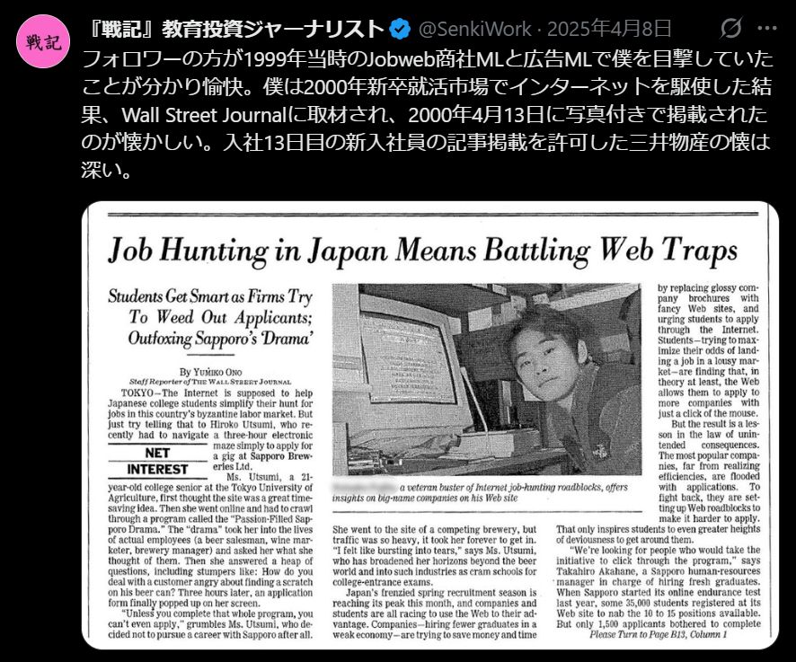 フォロワーの方が1999年当時のJobweb商社MLと広告MLで僕を目撃していたことが分かり愉快。僕は2000年新卒就活市場でインターネットを駆使した結果、Wall Street Journalに取材され、2000年4月13日に写真付きで掲載されたのが懐かしい。入社13日目の新入社員の記事掲載を許可した三井物産の懐は深い。