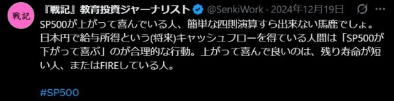 SP500が上がって喜んでいる人、簡単な四則演算すら出来ない馬鹿でしょ。日本円で給与所得という(将来)キャッシュフローを得ている人間は「SP500が下がって喜ぶ」のが合理的な行動。上がって喜んで良いのは、残り寿命が短い人、またはFIREしている人。