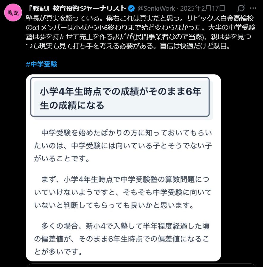 塾長が真実を語っている。僕もこれは真実だと思う。サピックス白金高輪校のα1メンバーは小4から小6終わりまで殆ど変わらなかった。大半の中学受験塾は夢を持たせて売上を作る訳だが(民間事業者なので当然)、親は夢を見つつも現実も見て打ち手を考える必要がある。盲信は快適だけど駄目。