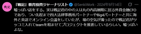 嘘っぽい話をする。実は戦記君の中の人は丸の内高層階に居る外資金融CFOであり、つい先程まで四大法律事務所パートナーやBig4パートナーと共に海外と英語でオンライン会議をしていたが、場の空気が濁ったので戦記君がツッコミ入れてteamを和ませてプロジェクトを推進しているらしい。嘘っぽいよな。